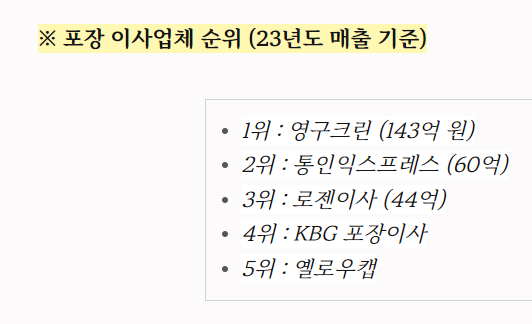 2023년 매출 기준으로 보면, 포장 이사업체 순위 1위는 영구크린으로 143억 원의 매출을 기록했어요.