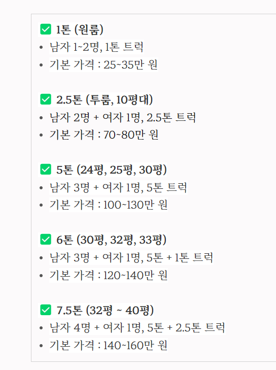 이처럼 이삿짐센터 가격은 이삿짐의 양, 작업 인원, 트럭의 크기와 조합에 따라 결정돼요. 그래서 동일한 집이라도 이삿짐센터마다 가격이 다를 수밖에 없답니다.